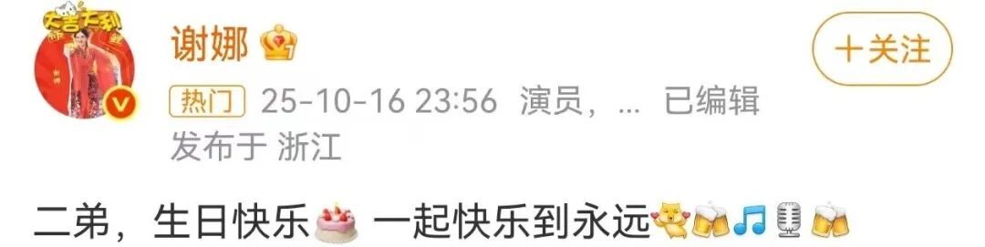 好友谢娜则晒出一张亲吻动图,并配文:二弟,生日快乐!一起快乐到永远。据悉此前,两人因在某综艺中多次撞衫,被调侃像《西游记》的金角银角大王,自此以大哥(谢娜)、二弟(赵丽颖)相称。