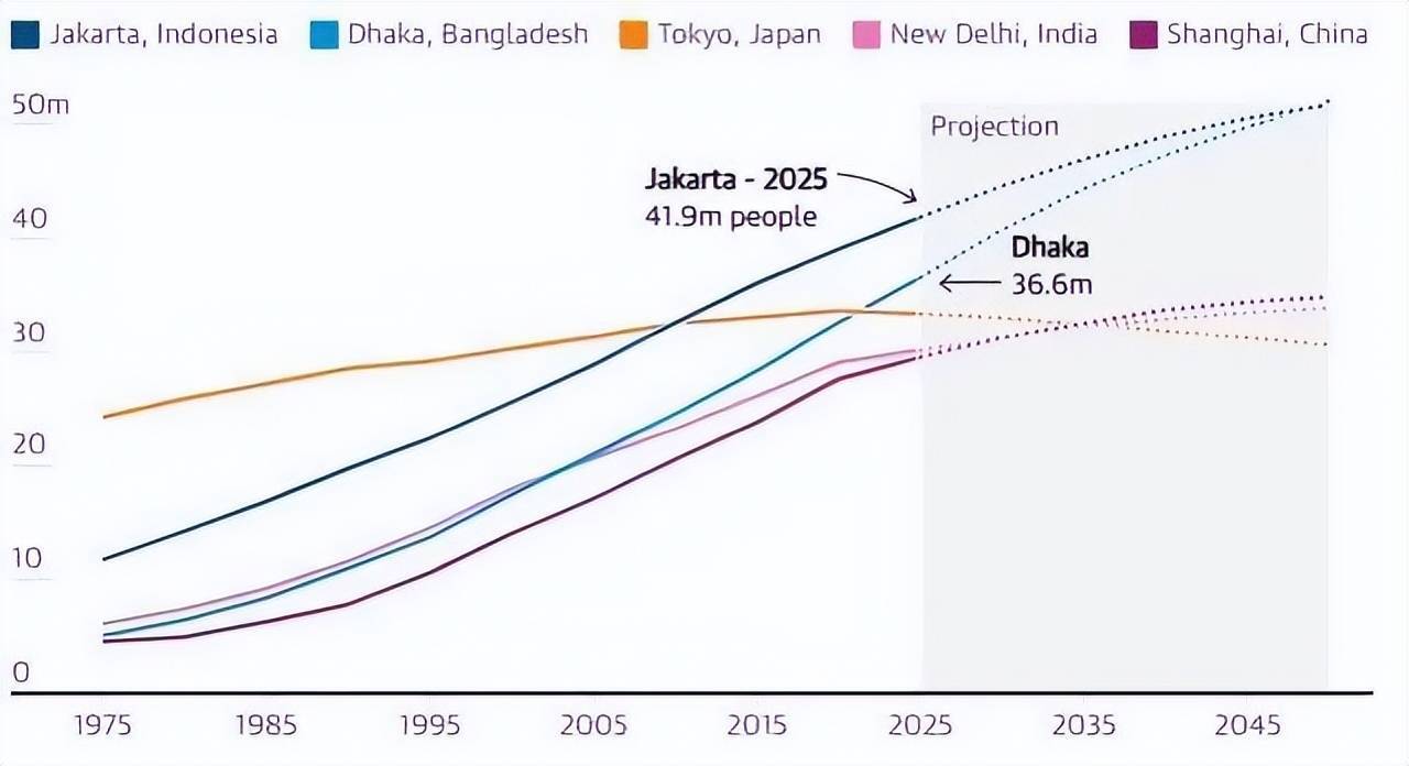 虽然雅加达目前位居榜首,但专家预测到2050年,达卡将成为全球人口最多的城市,人口预计将达到5210万。而届时,东京的人口预计将减少约270万。